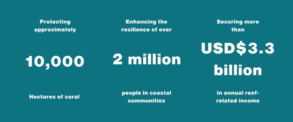 Overall, this solution protects approximately 10,000 hectares of coral, enhances the resilience of more than two million coastal people, and secures more than USD$3.3 billion in annual reef-related income in the region.